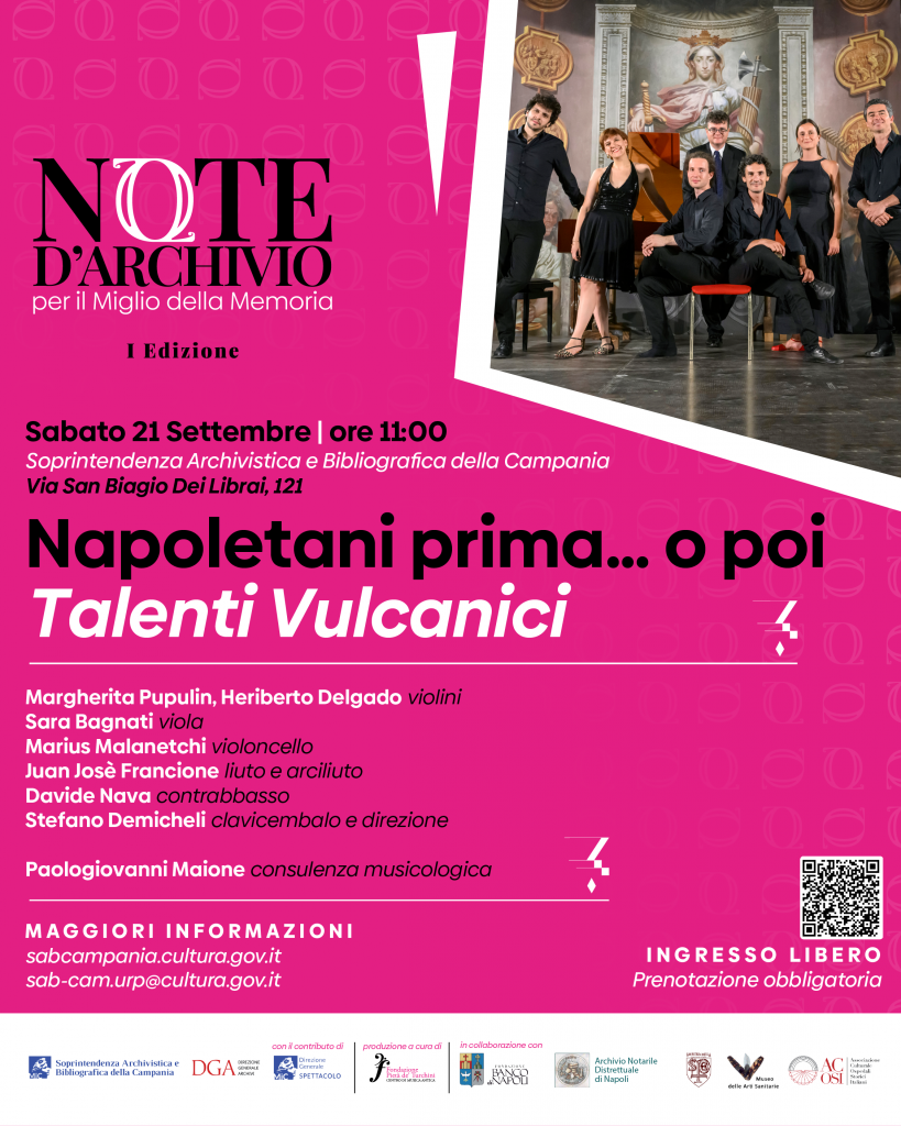 E’ da oggi possibile prenotare gratuitamente la partecipazione al concerto in programma sabato 21 settembre nella sede della Soprintendenza archivistica e bibliografica della Campania (Palazzo Carafa – via San Biagio dei Librai, 121).