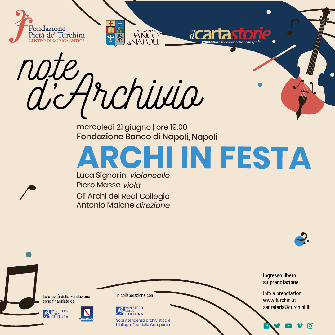 In occasione della Festa della Musica 2023, il giorno 21 giugno alle 19, si terrà il concerto Archi in Festa, primo appuntamento della rassegna Note d’Archivio, organizzata dalla Fondazione Pietà dei Turchini in collaborazione con la Fondazione Banco di Napoli e la Soprintendenza archivistica e bibliografica della Campania.