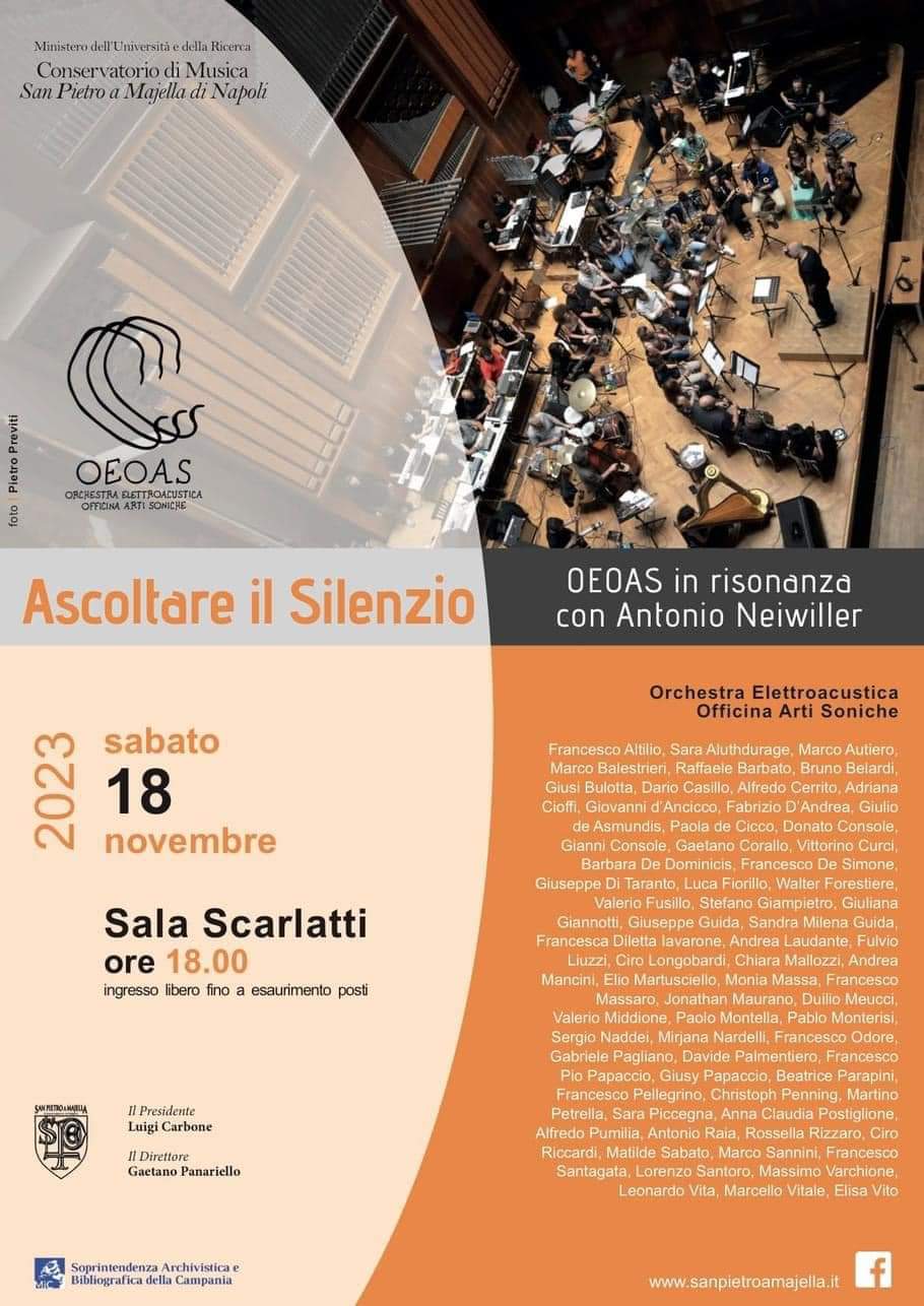 Sabato 18 novembre alle ore 18,00 presso la Sala Scarlatti del Conservatorio di San Pietro a Majella, l’Orchestra Elettroacustica Officina Arti Soniche produrrà il concerto “ASCOLTARE IL SILENZIO, OEOAS in risonanza con Antonio Neiwiller“, in collaborazione con la Soprintendenza archivistica e bibliografica per la Campania.