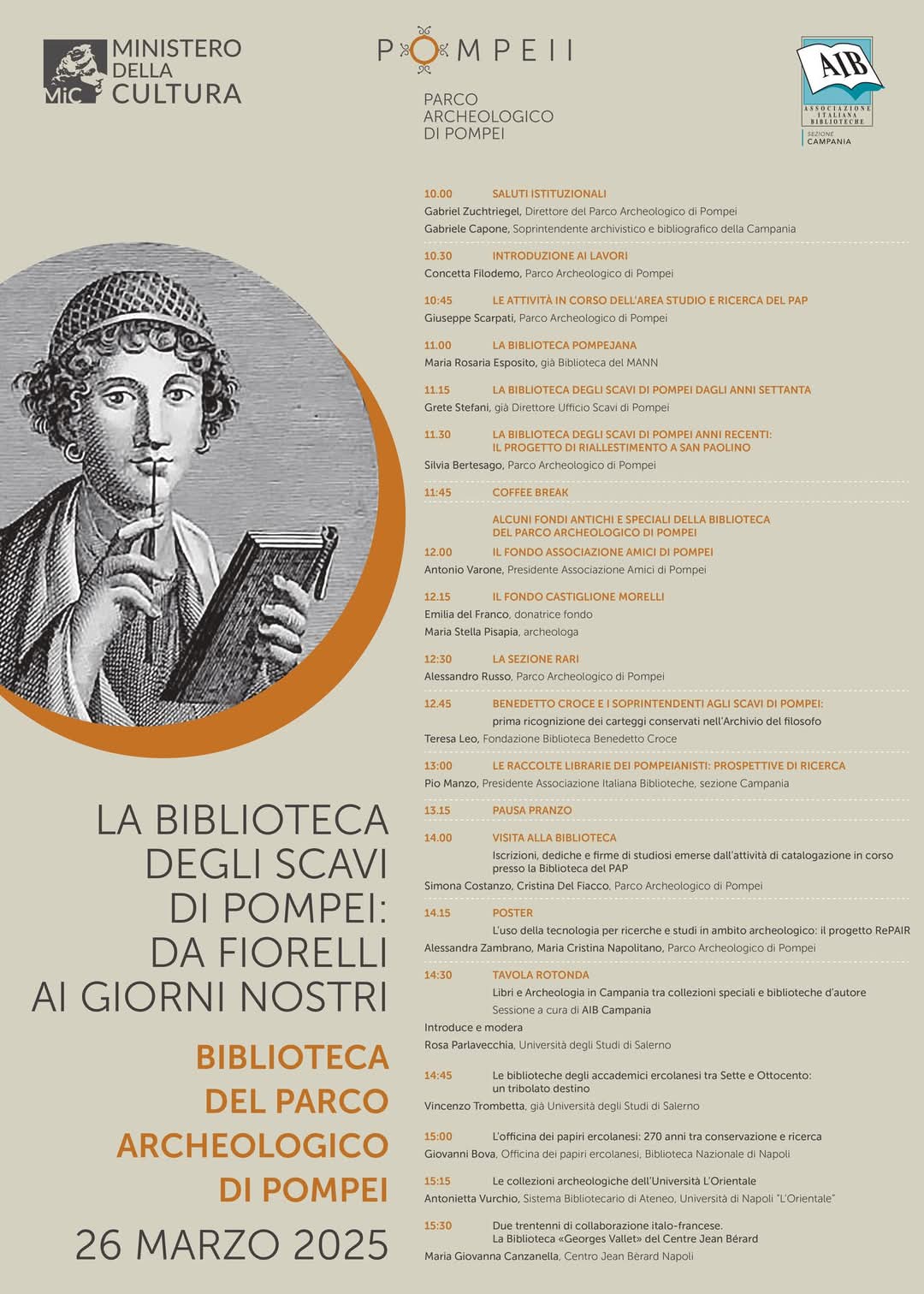Mercoledì 26 marzo a partire dalle ore 10:00 presso la Biblioteca del Parco Archeologico di Pompei si terrà il Convegno La Biblioteca degli Scavi di Pompei: da Fiorelli ai giorni nostri organizzato dal Parco Archeologico di Pompei in collaborazione con Associazione Italiana Biblioteche sezione Campania.