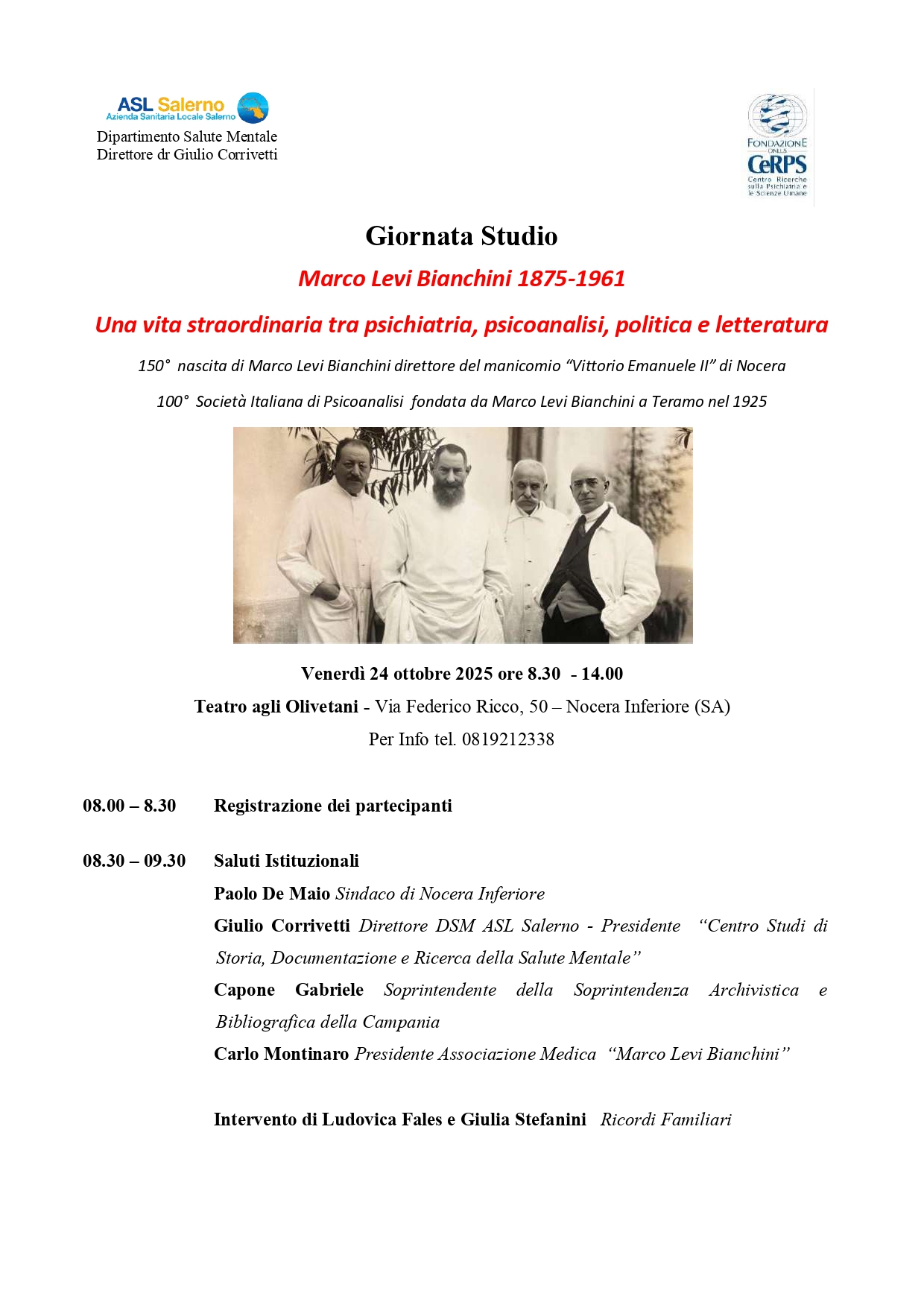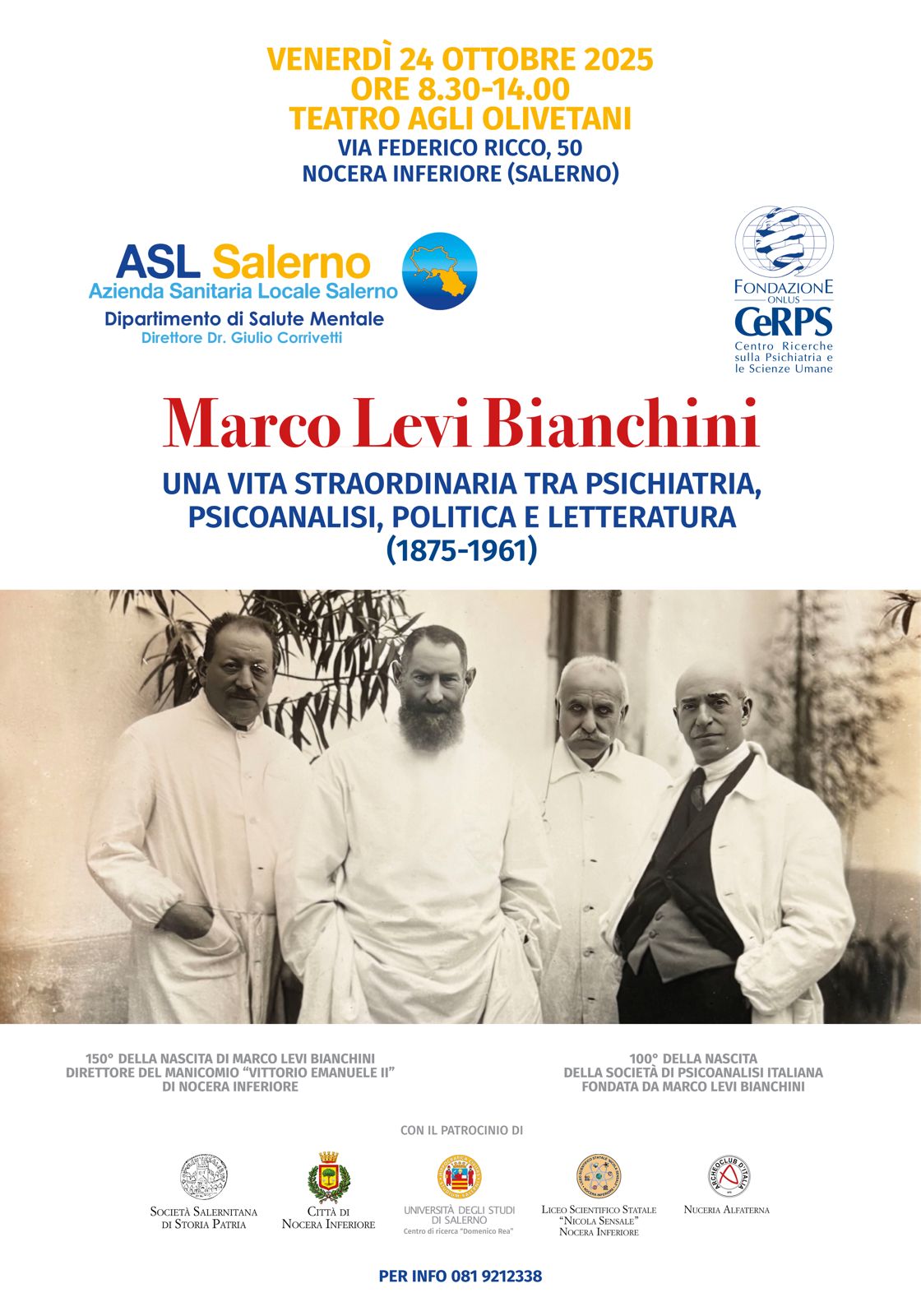 Il 24 Ottobre 2025 la Soprintendenza archivistica e bibliografica della Campania parteciperà alla Giornata Studio Marco Levi Bianchini (1875-1961): una vita straordinaria tra psichiatria, psicoanalisi, politica e letteratura organizzata dal DSM e Centro Studi di Storia, Documentazione e Ricerca sulla Salute Mentale ASL Salerno e La Fondazione Onlus CeRPS , con il patrocinio di Società Salernitana di Storia Patria, Comune di Nocera Inferiore, DIPSUM UNISA , Archeoclub Nuceria Alfaterna, Liceo Scientifico “Nicola Sensale” di Nocera Inferiore, presso il Teatro Agli Olivetani – via Federico Ricco 50 – Nocera Inferiore.