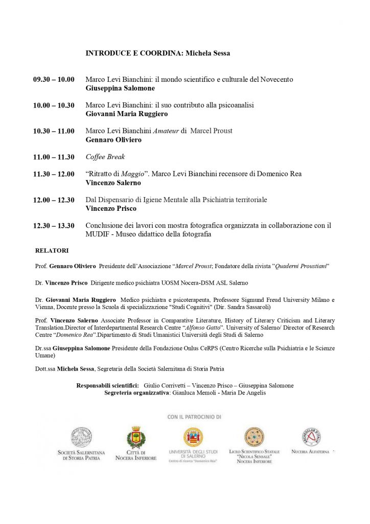 Quest’anno ricorrono i 150 anni dalla nascita del professor Marco Levi Bianchini ed i 100 anni dalla costituzione a Teramo della prima Società Italiana di Psicoanalisi da lui voluta e comunicata a Sigmund Freud. Levi Bianchini ha vissuto la maggior parte della sua vita a Nocera Inferiore, come assistente medico, primario e, poi, direttore del manicomio consortile “Vittorio Emanuele II” . La giornata studio approfondirà l’aspetto multiforme degli interessi dell’eclettico psichiatra ed il suo interesse per la psicoanalisi. In questo campo, infatti, è stato il primo traduttore italiano delle opere di Sigmund Freud e di altri psicoanalisti.