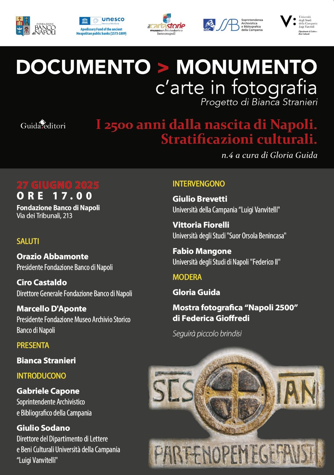 La Soprintendenza archivistica e bibliografica della Campania parteciperà, il 27 giugno alle ore 17, presso la Fondazione Banco Napoli, alla presentazione del quarto volume del progetto editoriale Documento>Monumento C’arte in fotografia (Guida editori) a cura di Gloria Guida, dal titolo I 2500 anni dalla nascita di Napoli. Stratificazioni culturali.