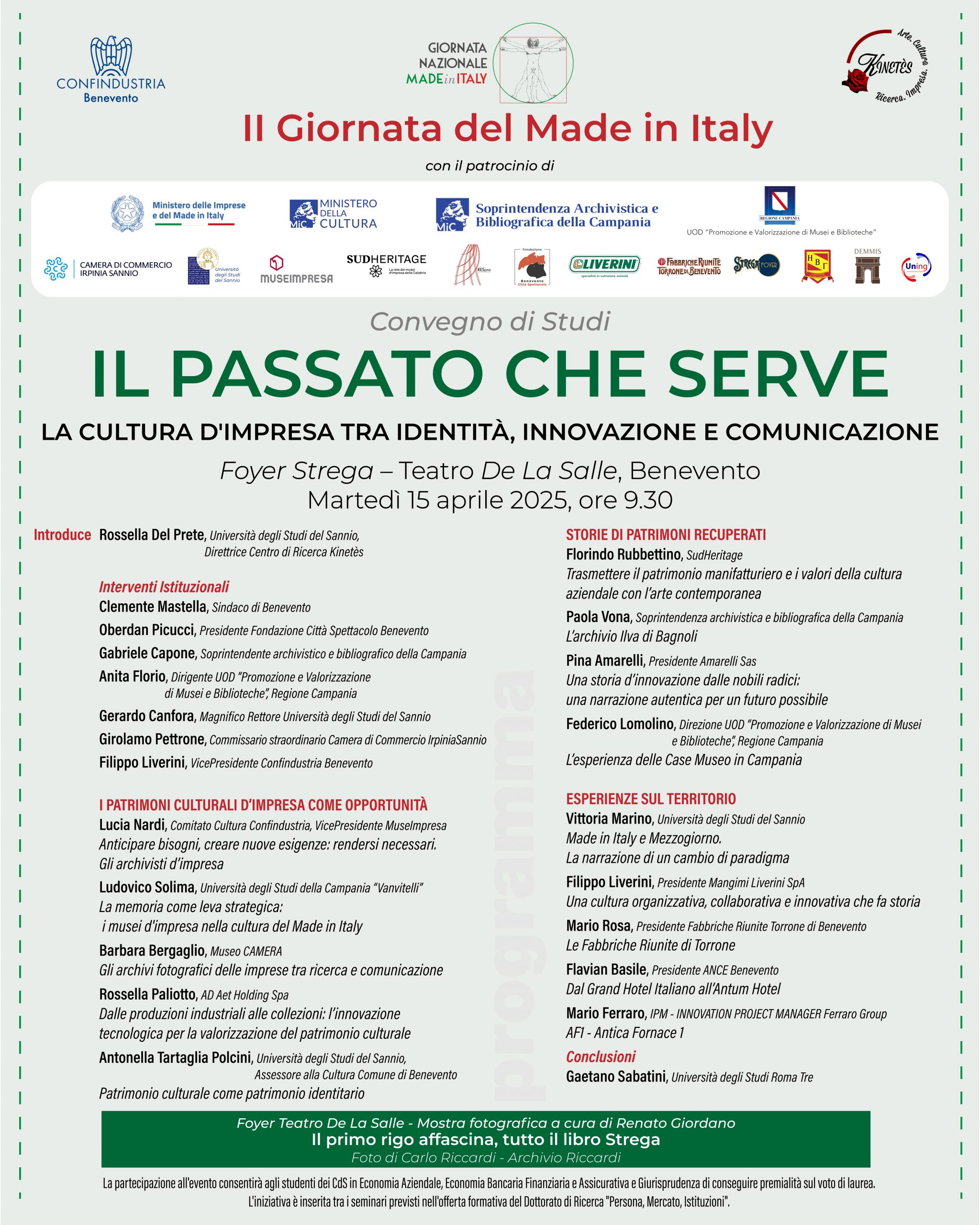 L’evento si terrà presso il Teatro De La Salle martedì 15 aprile con inizio alle ore 9.30 in occasione della Giornata nazionale del Made in Italy e ospiterà importanti referenti istituzionali, accademici e imprenditori che racconteranno, anche attraverso esempi concreti, l’importanza e il valore della conservazione della memoria.