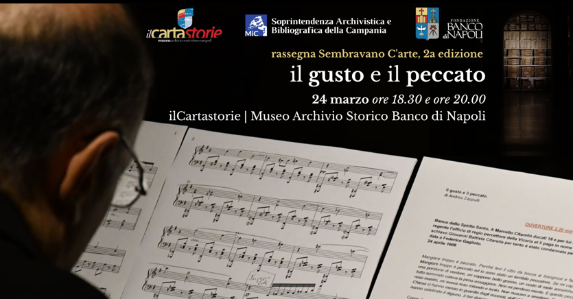 Le note avvolgeranno le carte dell’Archivio Storico del Banco di Napoli venerdì 24 marzo (ore 18.30 e ore 20.00) con la performance “Il gusto e il peccato”, con la musica di Fabrizio Romano e il reading di Giancarlo Cosentino, su testo di Andrea Zappulli.