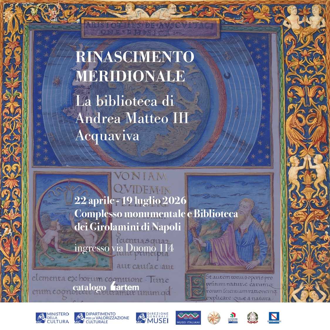 Da mercoledì 22 aprile 2026, a due anni dalla riapertura della Chiesa-Museo e dopo anni di interdizione, il Complesso monumentale e Biblioteca dei Girolamini di Napoli riapre le sale storiche della Biblioteca con la mostra Rinascimento meridionale. La biblioteca di Andrea Matteo III Acquaviva, a cura di Antonella Cucciniello e Teresa D’Urso.