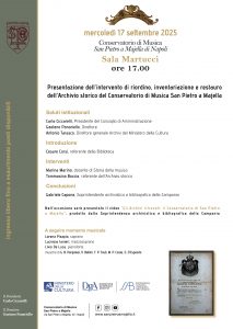 Presentazione dell’intervento di riordino, inventariazione e restauro dell’Archivio storico del Conservatorio di Musica San Pietro a Majella Mercoledì 17 Settembre 2025, ore 17:00 Conservatorio San