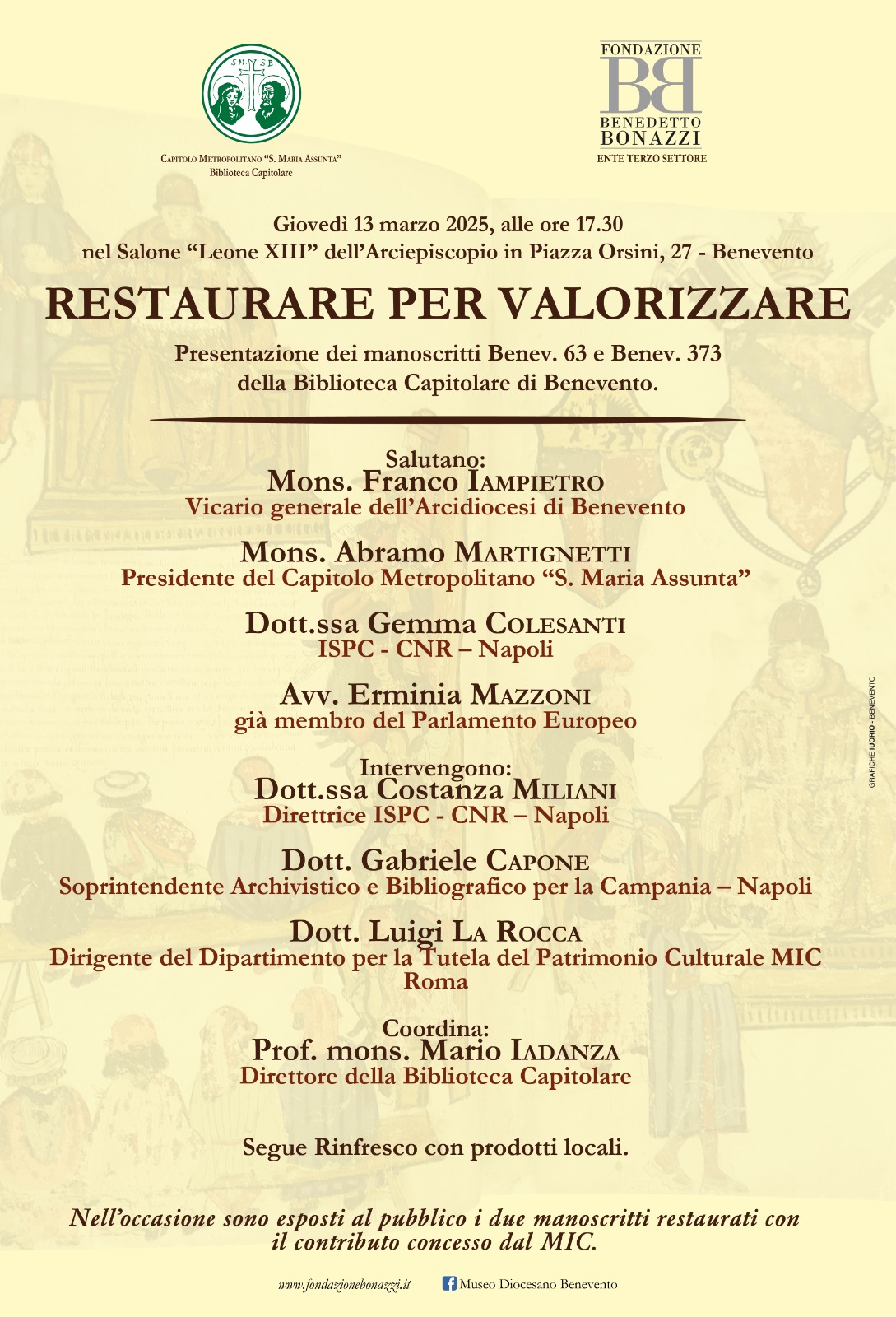 Giovedì 13 marzo 2025 alle 17.30, nel Salone “Leone XIII” dell’Arciepiscopio in Piazza Orsini 27 a Benevento, saranno presentati i lavori di restauro di due importanti manoscritti dell’archivio del Capitolo Metropolitano della Chiesa cattedrale di Benevento, straordinarie testimonianze della storia cittadina.